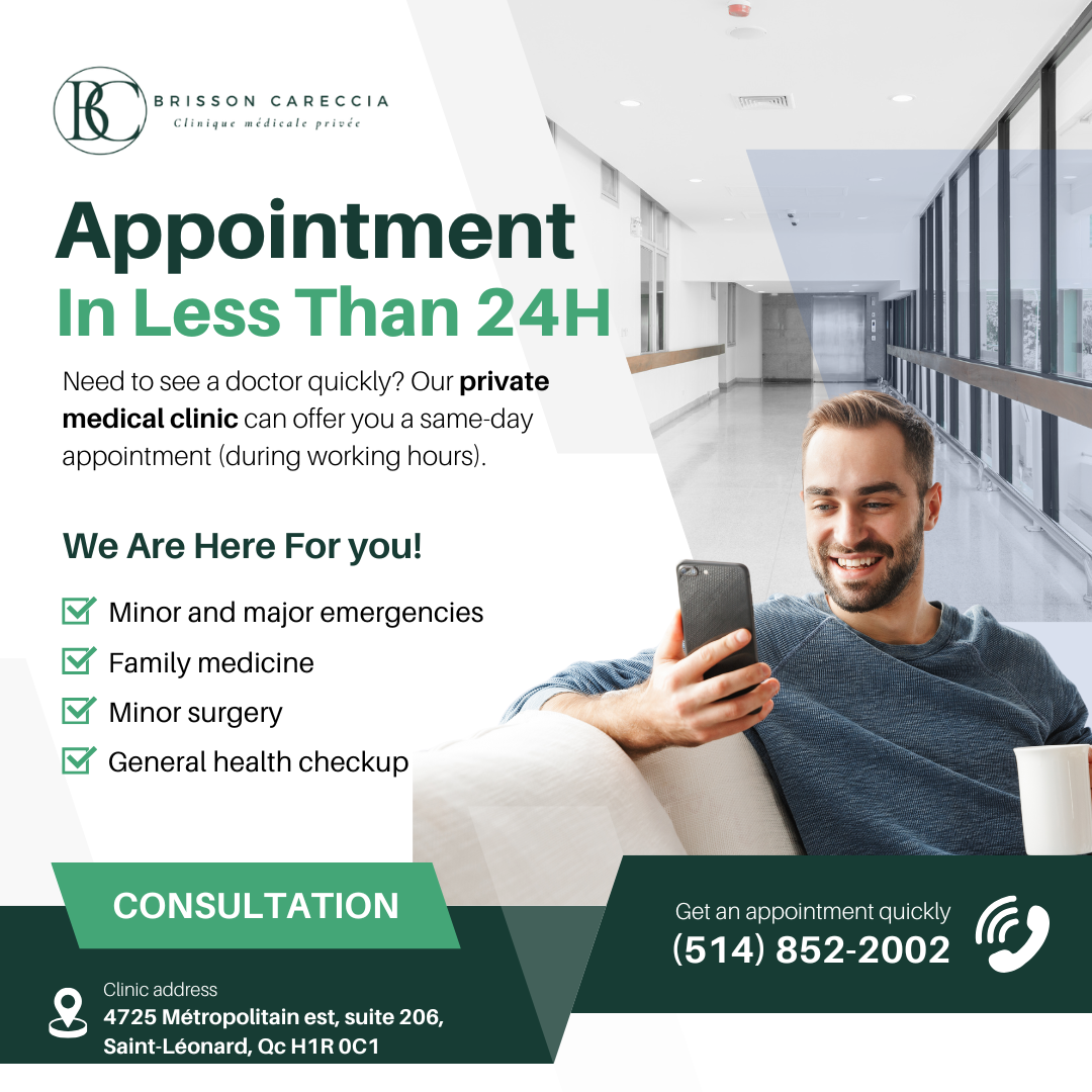 We will give you an appointment as quickly as possible, depending on your state of health, which can take from 24 to 48 hours. However, if your health problem is an emergency, we suggest you call 911.